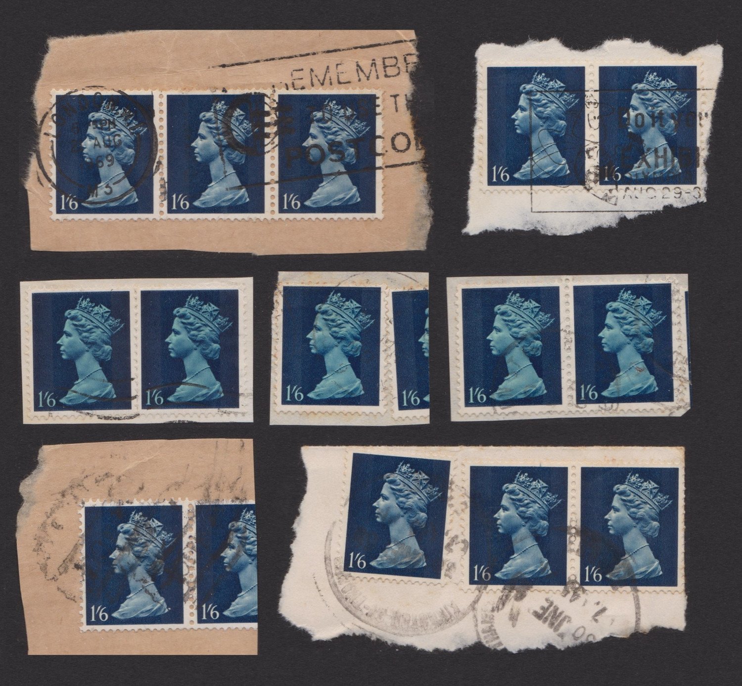 Great Britain 1/6 Machin stamps with light blue color missing? Interspersed with normal bi-colored stamps for comparison, all used on pieces of covers with contemporary cancels.