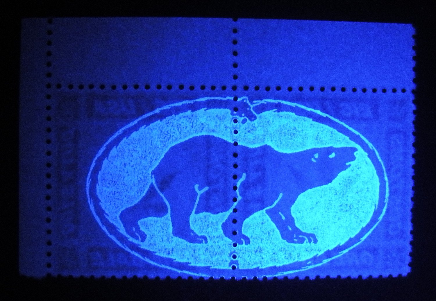 Backside of Embassy of Imperial Coldland 'Special Commerce' Marijuana Revenue stamps, showing 'Stalking Bear' invisible UV security feature.